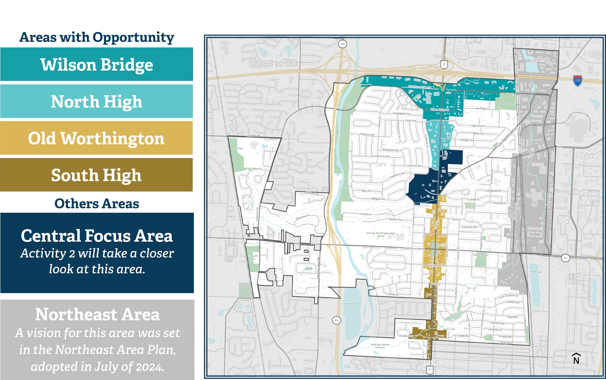9. Business corridors are modernized to support a resilient economy and workforce. We will expect new mixed-use office development or complementary uses that strengthen existing offices areas in the High Street and Wilson Bridge Road corridors. In the Northeast Area, we will pursue clean and flexible light-industrial and innovation space, provide small-business and incubator opportunities, and create smaller mixed-use nodes to serve these employment uses.