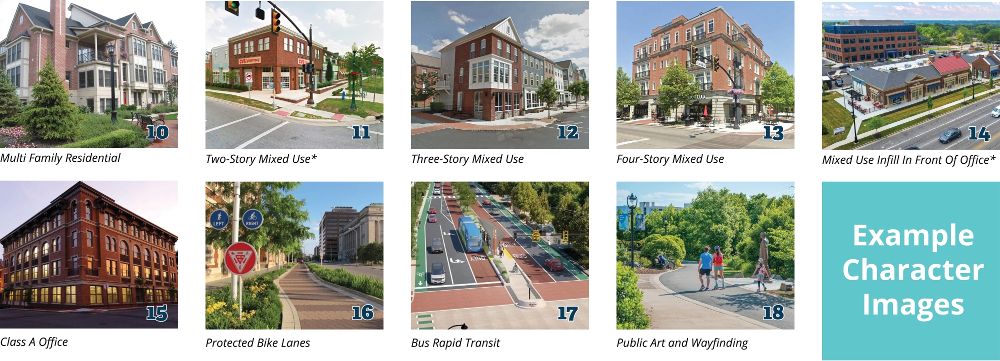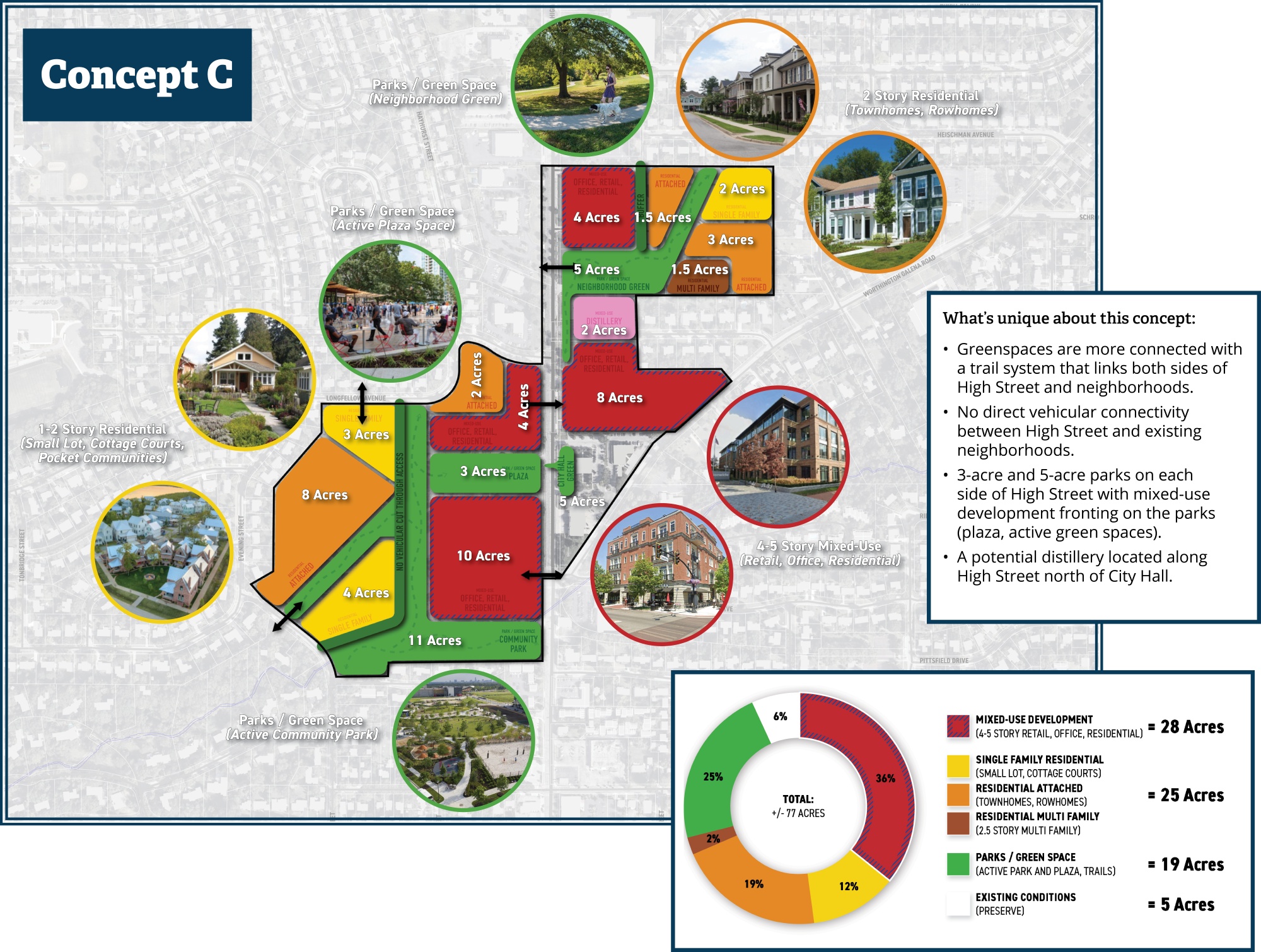 What should the future of the Central Focus Area look like? Review the three land use and character concepts below that were drafted by the Community Committee based on what they’ve learned in the planning process so far. These concepts are not specific proposals, but are intended to get community feedback on what elements of the area’s future are most supported.