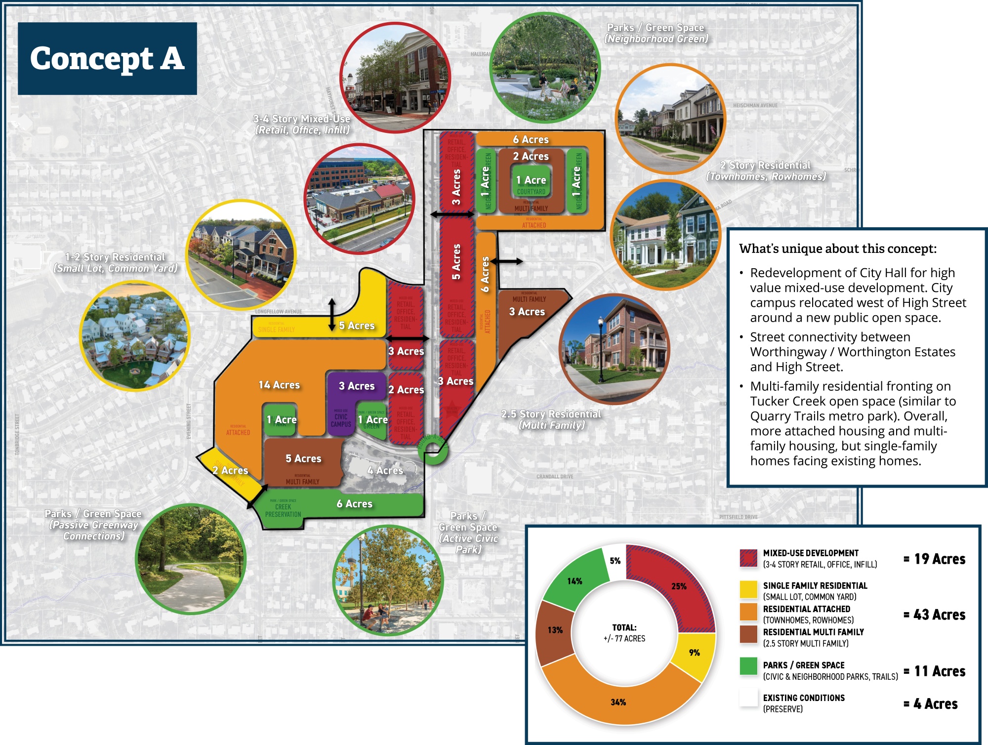 Principles describe the intent about “how” (generally) and “where” (conceptual location) growth and development in Worthington should occur in the future. They are based upon community input and reflect a variety of themes that are mutually reinforcing, including the type, quality, appearance, pattern, character, and organization of development; environmental quality; efficient use of infrastructure; and expanding connectivity and mobility choices.