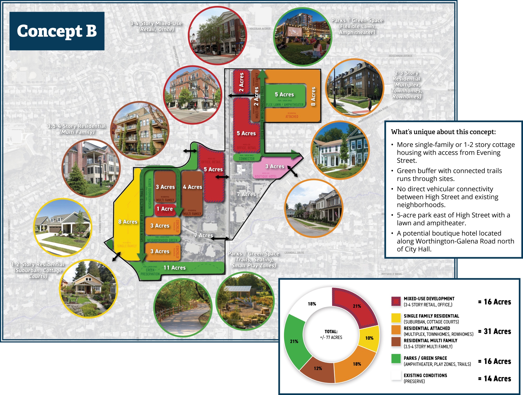 3. Allow greater building heights, high-quality building materials, and architectural styles that are distinct to this area of Worthington. Reduce building scale as a transition to nearby residential areas.